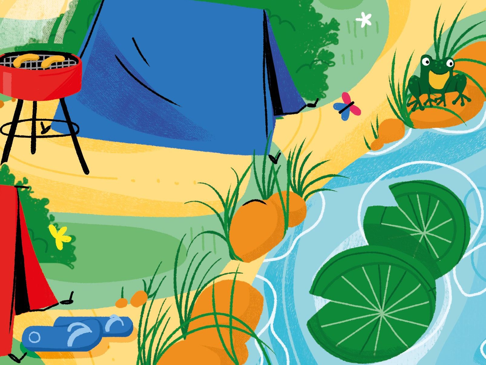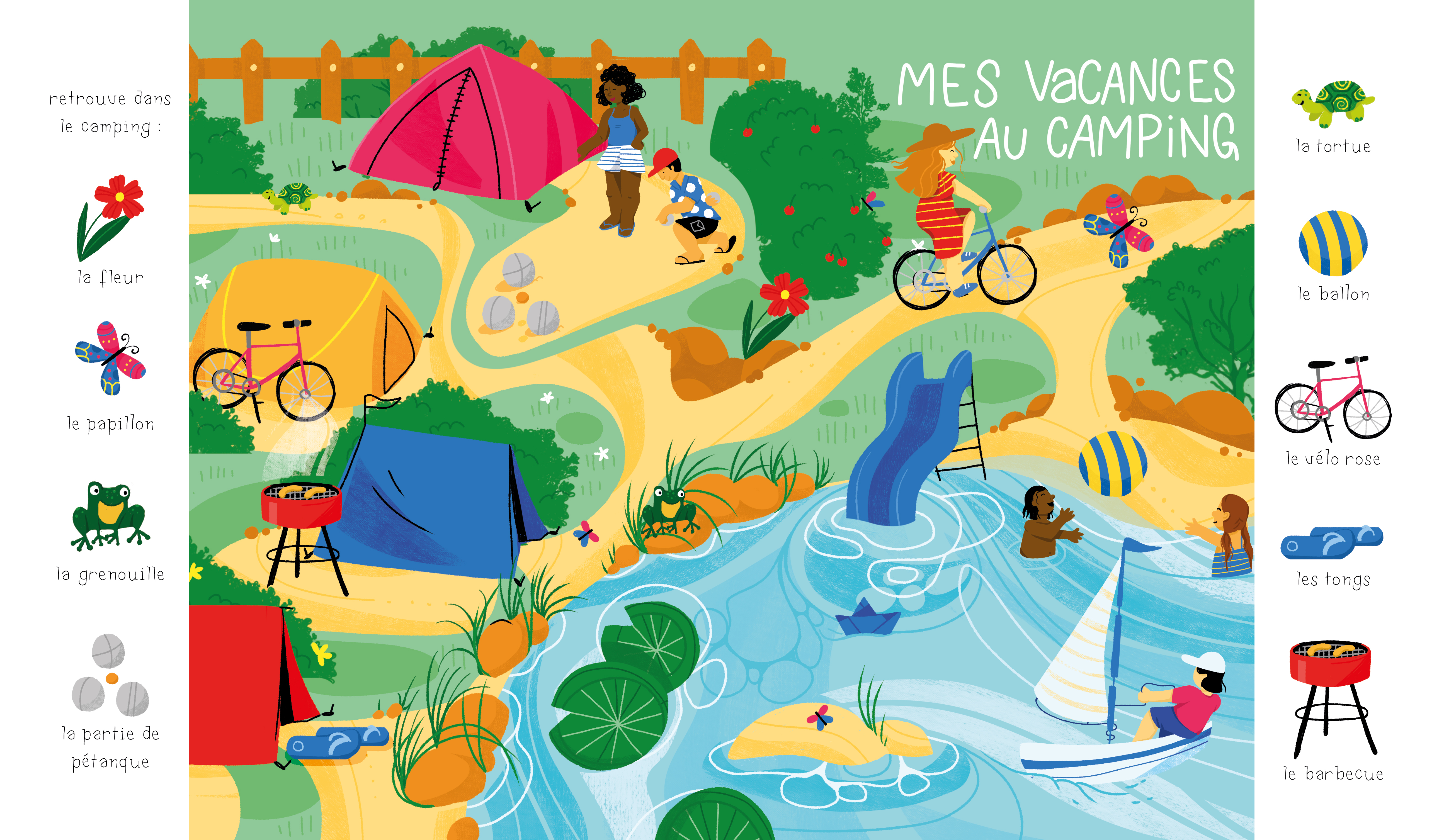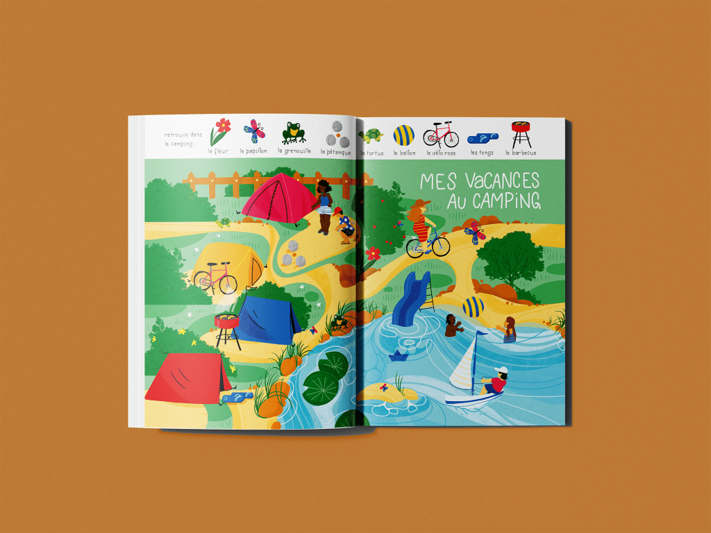 création d’un cherche et trouve pour un projet éditorial non sorti. Autour du thème des vacances au camping, illustration d’activité et d’éléments qu’on retrouve en vacances.